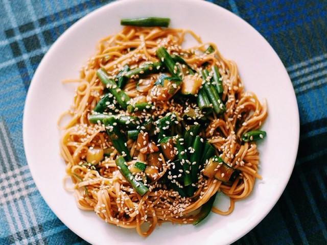 6. Выложите в сковороду лапшу, все перемешайте, держите на огне еще 2-3 минуты. За это время несколько раз перемешайте.