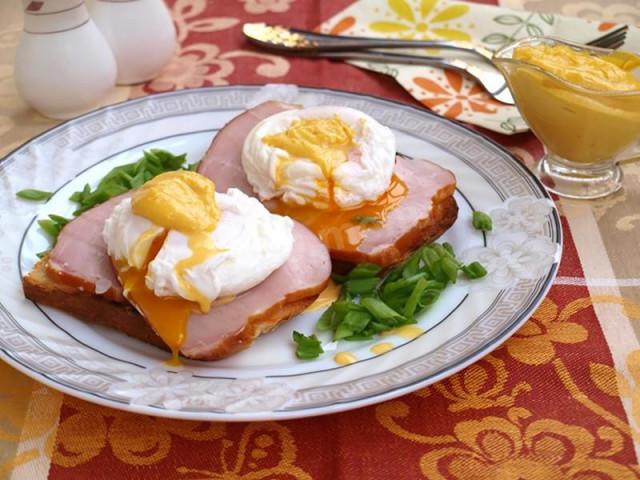 - на остывшие тосты выкладываем по кусочку ветчины, сверху - яйцо пашот и завершаем вкусную конструкцию голландским соусом.