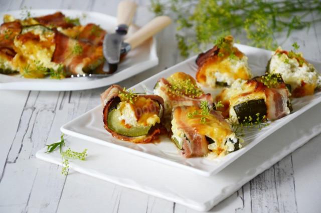 Быстрый рецепт для сытного обеда или ужина. Для этого рецепта также можно использовать обычные кабачки. Количество бекона зависит от длины выбранных цуккини. Если овощи не очень большие, хватит 1-2 ломтиков на каждую половинку.