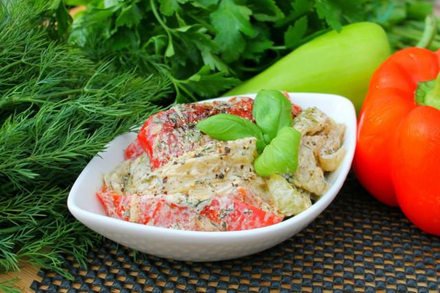 Совершенно лёгкое и невероятно вкусное блюдо! Молодые кабачки с перцами в сметанном соусе с ароматными специями -это прекрасный вариант для ужина или быстрого перекуса! Блюдо с овощами в пикантном соусе послужит отличным дополнением к мясу, курице и рыбе.