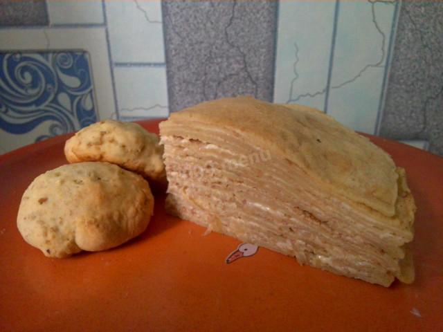 В остывший крем добавить отложенный лук и собрать торт, намазывая каждый блинчик тонким слоем. Убрать в холодильник минимум на 1 час.