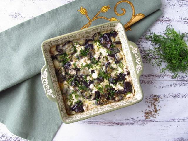 Форму для запекания смазать сливочным маслом. Выложить баклажаны с сыром, разровнять.