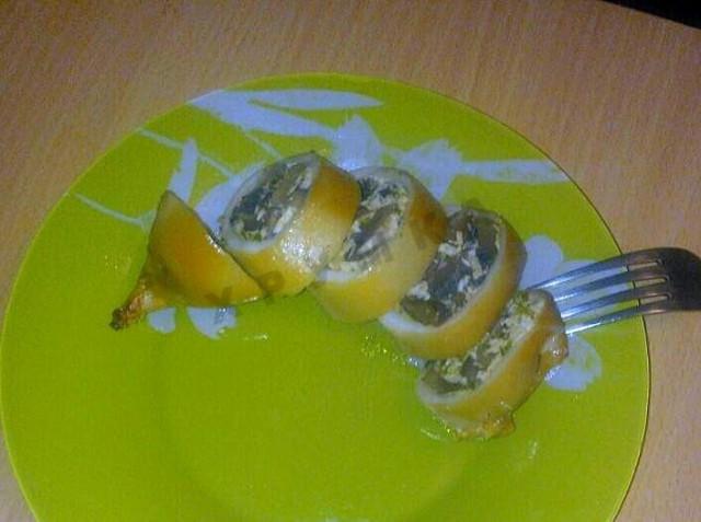 Фаршем заполнить тушку кальмара не полностью. Закрепить кальмар зубочисткой.