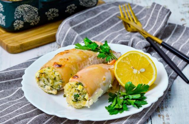 Кальмары фаршированные рисом и яйцом со сметаной в духовке