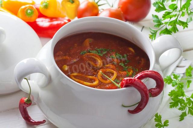Пикантное блюдо из кальмаров! Обязательно попробуй! Кальмары в томатном соусе - необычное блюдо, которое можно подать самостоятельно или же в качестве подливы к рису. Любителям остренького перец чили можно порезать колечками и перед подачей не извлекать - это придаст блюду больше остроты. Томатный соус в рецепте смело можно заменить заготовкой лечо - будет вдвойне вкуснее.