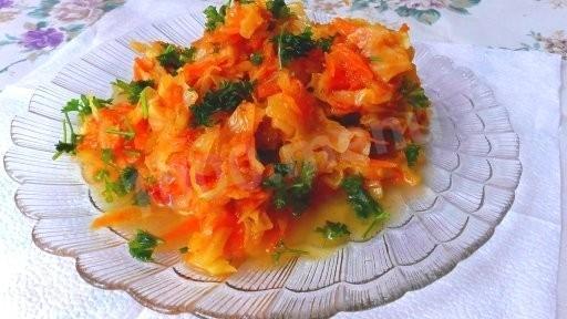 Капуста тыква морковка лук тушеные с помидорами в сковороде
