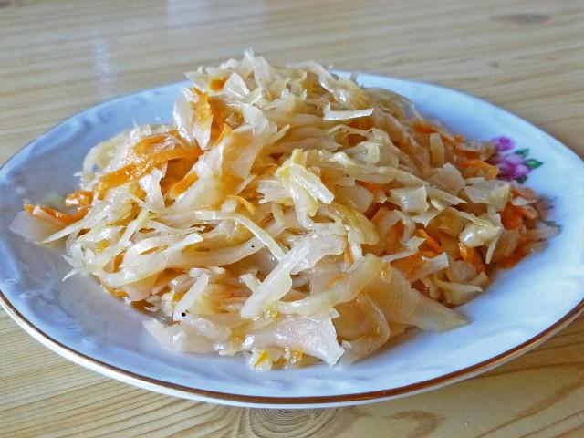 Самая вкусная тушеная капуста получается в утятнице. Времени на приготовление капусты таким способом уходит около часа. В данном рецепте для более выразительного вкуса в капусту при тушении добавляется рассол от огурцов. Также подойдет маринад от помидоров или других консервированных овощей или томатный сок. Очень вкусной при тушении получается квашеная капуста. В данном случае берем капусту свежую, поэтому нам понадобится рассол.