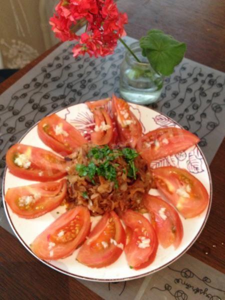 Капуста жареная с помидорами и чесноком