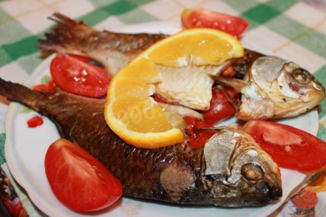 Достаем карасей и укладываем на большое, слегка нагретое блюдо. Я украсил кружками помидоров, дольками лимона и веточками петрушки.