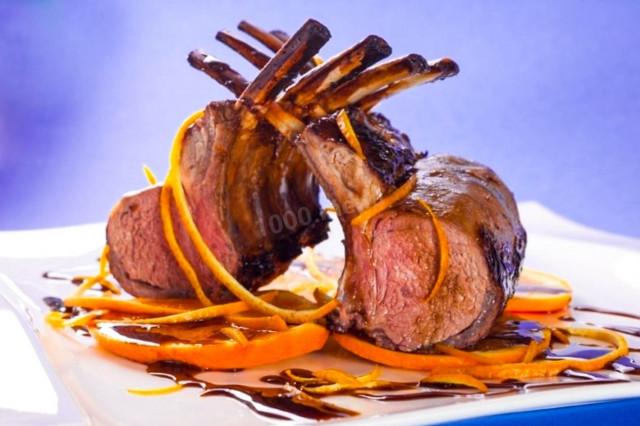 Корейка относится к высокосортным частям бараньей туши. Ее очень легко готовить, а испортить можно, пожалуй, только передержав в духовке. Я предлагаю вариант сервировки, когда ребра ставятся на тарелке "шалашиком", образуя классическое "каре" - "скрещение", "клетку". Можно, однако, нарезать их на последнем этапе и поштучно, разложить веером или составить в форме пирамидки - все это тоже будет считаться "каре".