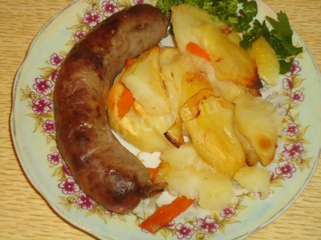 Включаем духовку и разогреваем ее до 180 градусов. Берем противень выкладываем на него колбаски домашние. Сверху их покрываем овощами. Запекать надо такую еду около 40 минут, а точнее до тех пор, пока не приготовится картофель.