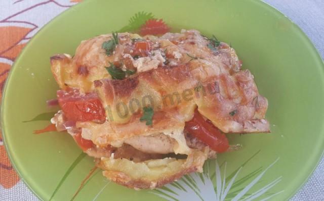 Один из вариантов любимой картошки по-французски. Сочетание диетической индейки и картофеля, острых помидоров и сыра, приправленных майонезом, делает блюдо очень сочным и нежным.