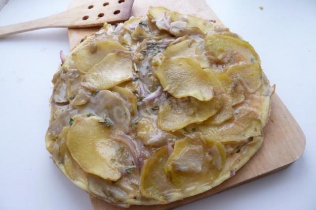 Перекладываем картофель в яичную массу,затем снова отправляем на плиту.И затем в духовку.