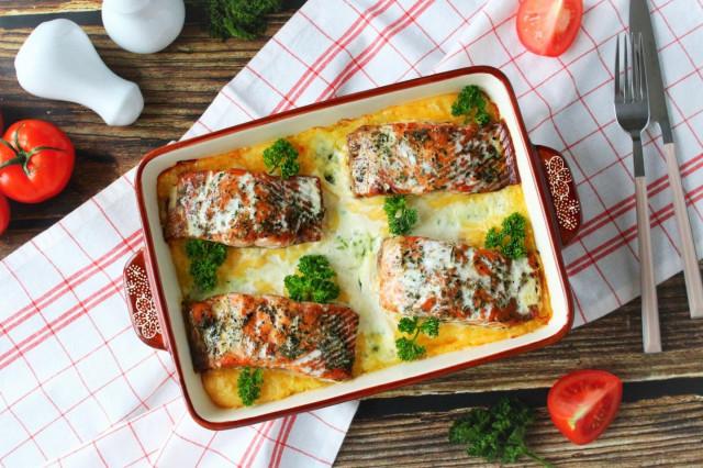 Из картофельного пюре, с красной рыбой, ярко, красиво, вкусно! Такая запеканка в духовке по времени готовится не намного дольше, чем обычное пюре и рыба. А вот эффектная подача превращает его из обыденного блюда в праздничное.