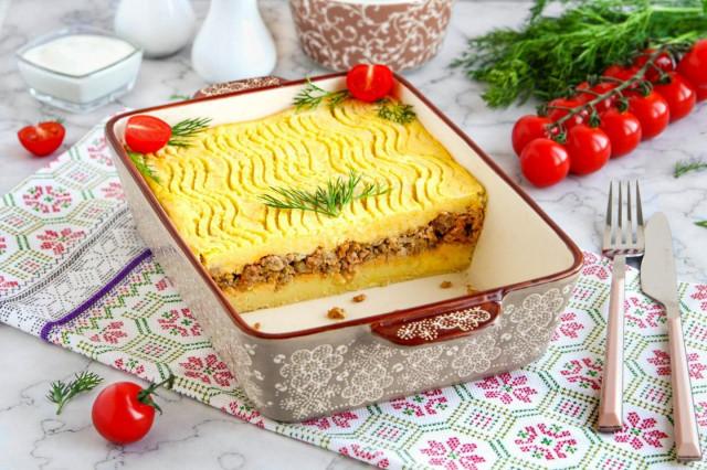 Закройте слой фарша оставшимся картофельным пюре, разровняйте.