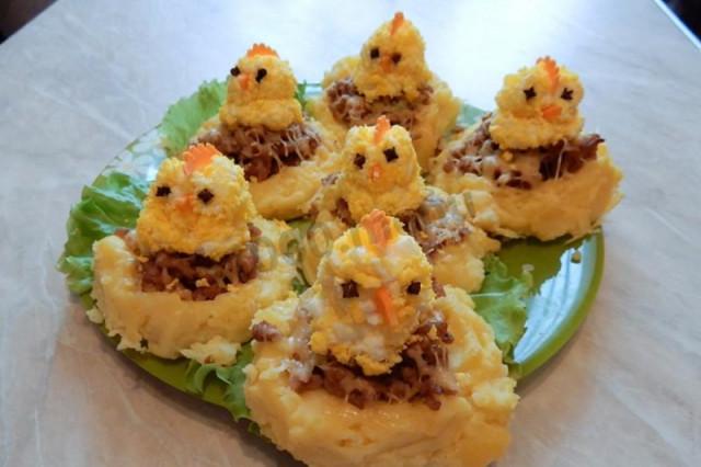На блюдо выложить запеченные гнезда. Сверху на гнезде из двух шариков сформировать цыпленка. Из отваренной небольшой морковки вырезать гребешки и клювики, поместить их на голову цыпленку на свои места. Из перчинок или гвоздичек сделать глаза цыплятам.