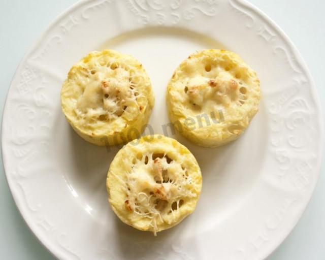 Затем в картофельные гнезда выложить начинку из куриного филе и лука (выкладывать плотно).