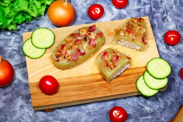 В это время приготовьте соус. Как сделать соус? Нарежьте кубиками бекон и оставшуюся луковицу. На сковороде разогрейте растительное масло, выложите в него лук и бекон. Обжаривайте их на небольшом огне до золотистого цвета. В конце приготовления добавьте по вкусу соль.