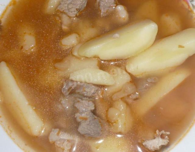 В кастрюлю налить воды довести до кипения, свинину нарезаем и бросить в кипящую воду, картофель почистить нарезать на большие дольки и тоже опустить в воду.
