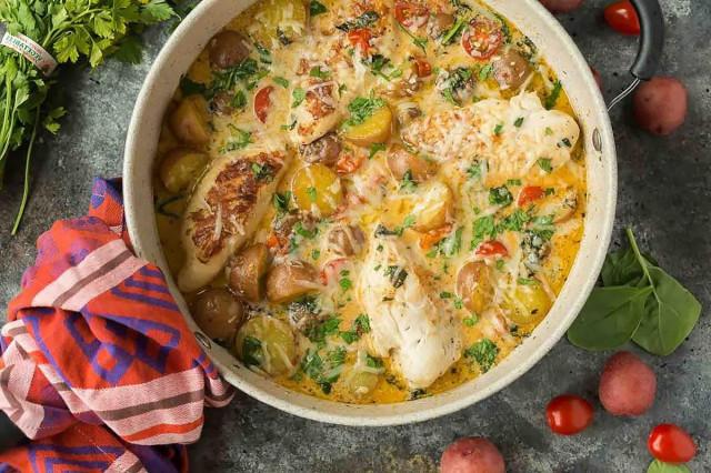 Восхитительная идея для семейного ужина! Готовь родным! Картошка с филе в сметане - недорогое и простое блюдо. Ведь в данном рецепте готовится одновременно и горячее, и гарнир к нему. За счет использования заправки на основе сметаны и куриного бульона филе получается сочным, а тушеные овощи служат хорошим дополнением к мясу.
