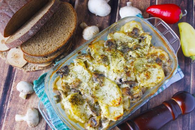 Форму для запекания смазать растительным маслом и предварительно нагреть в духовке, чтобы картошка не прилипла ко дну. Смешать картошку, зажарку из грибов и лука, измельченный укроп и сметану. Все посолить, поперчить, опять перемешать и аккуратно выложить в форму.