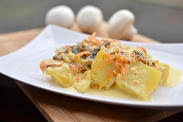 Отличное блюдо для всей семьи! Попробуй и оцени! Картошка с шампиньонами в сметане - простое, недорогое и в то же время очень сытное блюдо, которым можно без проблем накормить гостей и домочадцев. Вкуснейший картофель со сливочным вкусом дополняют пикантные жареные грибочки с овощами. Это делает запеченную картошку прекрасным блюдом, способным занять достойное место в семейном меню.