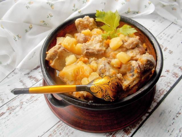 Свиные ребрышки моем и разрезаем на части. Лучше всего взять небольшие, мясистые и не заветренные ребрышки. В них обычно больше вкусных хрящиков, а не жестких костей. Тогда и тушеная картошечка получится ароматной, наваристой и без посторонних привкусов.