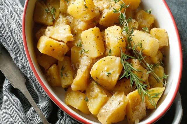 Попробуй эту ароматную картошечку и оцени! Картошка в сметане с чесноком - аппетитное блюдо, которое запомнится не только своим прекрасным вкусом, но и изумительным ароматом. Чеснок в сочетании с веточками свежего розмарина придает тушеному картофелю остроту и пикантность.
