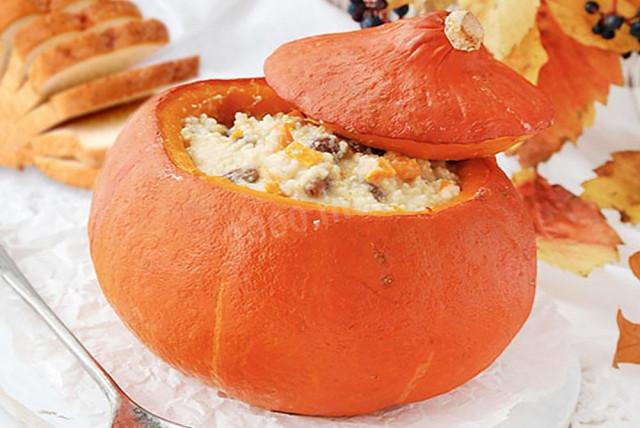 После сигнала мультиварки открыть крышку и аккуратно извлечь тыкву из чаши прибора, наклоняя ее немного вбок. Переложить тыкву, начиненную молочной кашей и изюмом, на тарелку и подавать на стол прямо в тыкве.