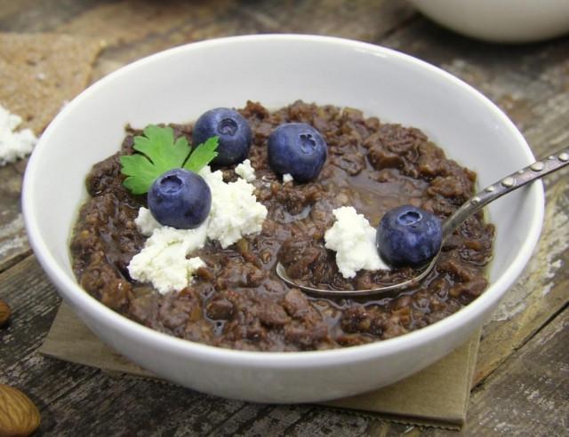 Каша из зелёной чечевицы на завтрак хорошо сочетается со свежими ягодами (как ни странно) и с мультизлаковыми хлебцами с творожным крем-сыром.