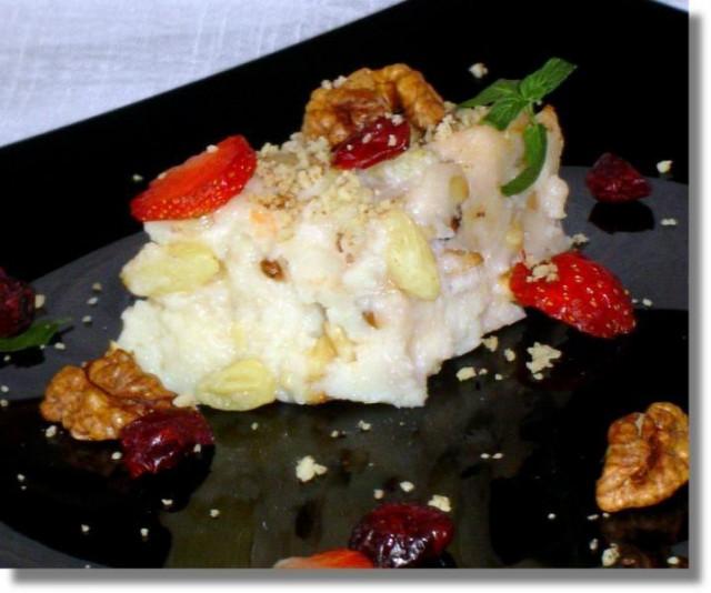 Готовую кашу охлаждаем, выкладываем на блюдо, добавляем клубнику.