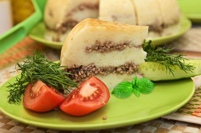5. Чашу от мультиварки смазываем кусочком сливочного масла, затем формируем нижний слой. Для этого выкладываем треть пюре, разравниваем. Далее идет слой фарша - выкладываем половину. Снова картофель - кладем вторую треть, разравниваем. Выкладываем оставшийся фарш, равномерно распределяя по предыдущему слою картошки. Сверху кладем остатки пюре, разравниваем.