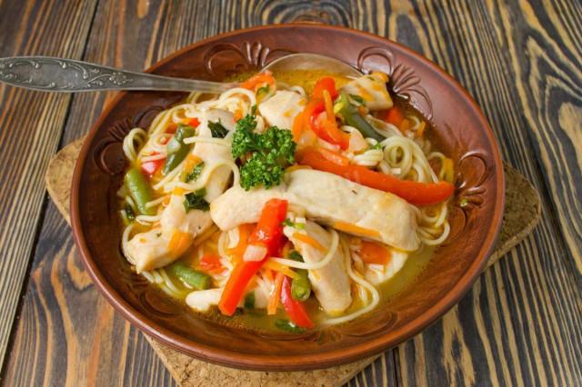 Вкуснейший сытный суп из солнечного Узбекистана! Классический лагман с курицей - национальное блюдо с восточным колоритом. Представляет собой достаточно густой суп с тонкой домашней лапшой и различными овощами. В данном рецепте используется куриное филе, благодаря которому лагман получается очень нежным и деликатным на вкус.