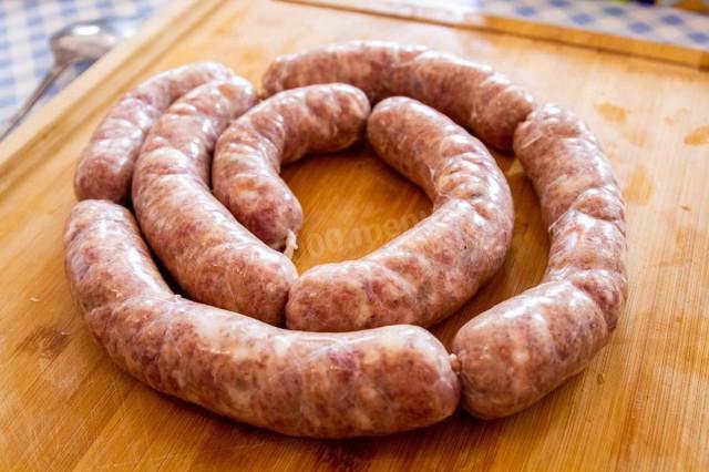 Тонкие свиные кишки тщательно промываем внутри и снаружи. Но лучше использовать подготовленный магазинный вариант. Перед наполнением колбасок их не нужно разрезать на порционные части. Наполняем одну, отрезаем, оставляя небольшой хвостик, и завязываем колбаску. Лучше всего если длина каждой получится 12-15 см.