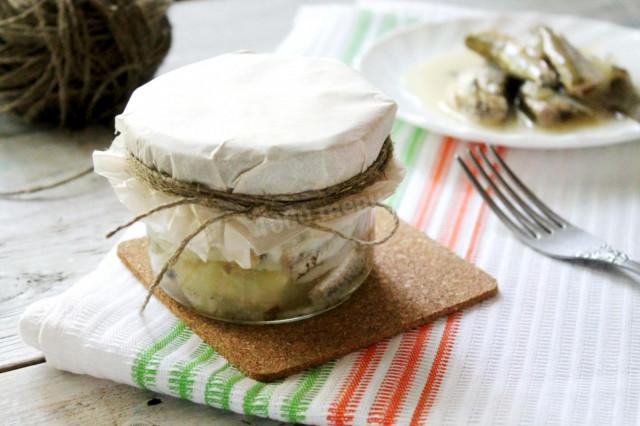 Раскладывайте горячую рыбу с заливкой в стерильные банки и закрывайте прокипяченными крышками, у меня вышло 5 200-граммовых баночек.