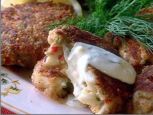 При подаче на стол, каждую крабовую лепешку полейте лимонно-укропным соусом.