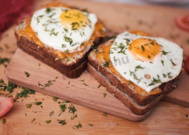 Отдельно поджариваем яйца-глазунью. Кладем яйцо сверху на сэндвичи.