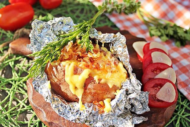 Картошку проверяем на готовность, проколов зубочисткой. Разворачиваем фольгу, делаем продольный надрез на клубне, ложкой разминаем мякоть, добавляем немного чесночной кашицы и кусочек сливочного масла, щедро посыпаем тертым сыром.