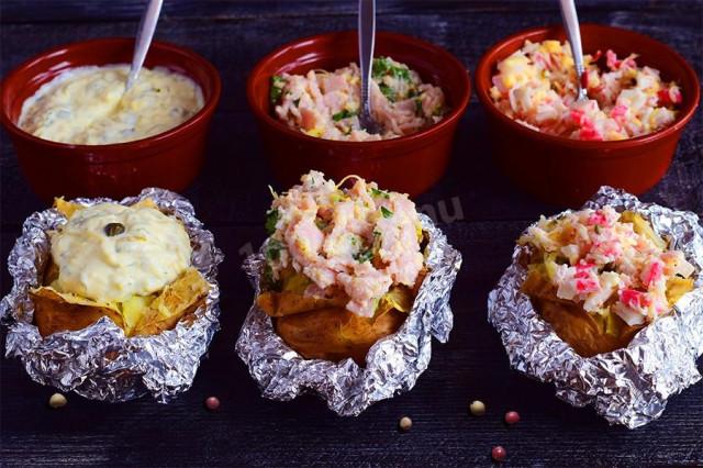 За это время картошка наверняка уже готова, поэтому достаем ее из духовки, разворачиваем, делаем крестообразный надрез на каждом клубне, немного разминаем вилкой мякоть, выкладываем по кусочку сливочного масла и фаршируем начинкой.