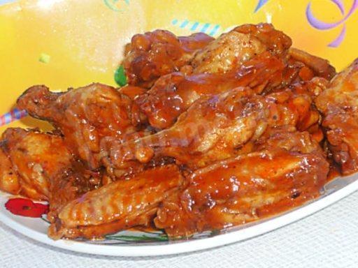 Теперь на сковороду наливаемнемного растительного масла, хорошо нагреваем и выкладываем крылышки, но без соуса. Слегка поджариваем (зарумянить) и добавляем оставшийся соус, помешать инакрыть крышкой, потушить минут 10, добавляем 1-2 ст.л. томатной пасты, размешиваем, пробуем на вкус, если надоподсолить и еще минут 7-10 доготавливаем наши крылышки.