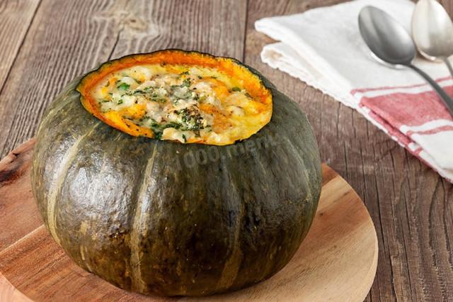 3. Отваренную перед этим кукурузную кашу кладем во внутрь тыквы. Сверху кашу посыпаем тертым пармезаном и сухими специями по своему вкусу. Кладем немного свежей зелени по желанию. Накрываем все плотно срезанной тыквенной верхушкой с хвостиком.