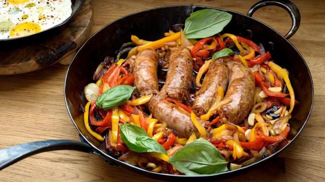 10. Итак, выкладываем купаты к овощам, жарим до румяности со всех сторон.