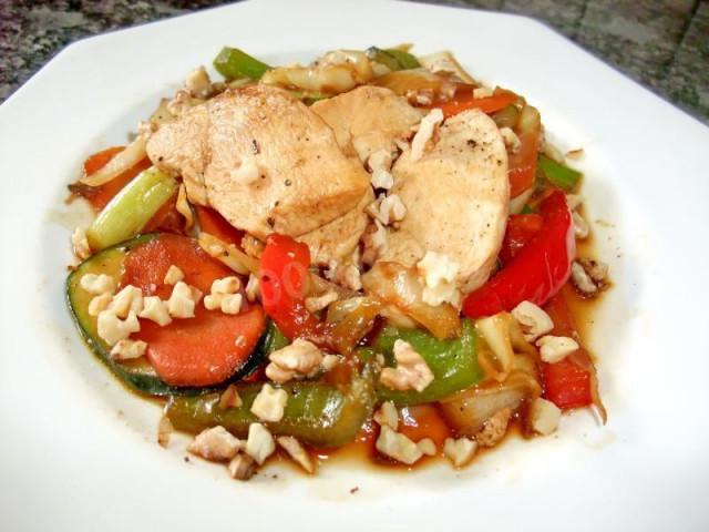 Выкладываем обжаренную с овощами куриную грудку на тарелки и посыпаем поджаренными орешками.
