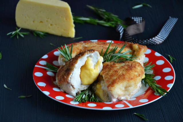 Сложить стороны кармашков, снова придавая им вид целого куриного филе и сколоть края зубочистками, чтобы сыр не вытек при запекании.