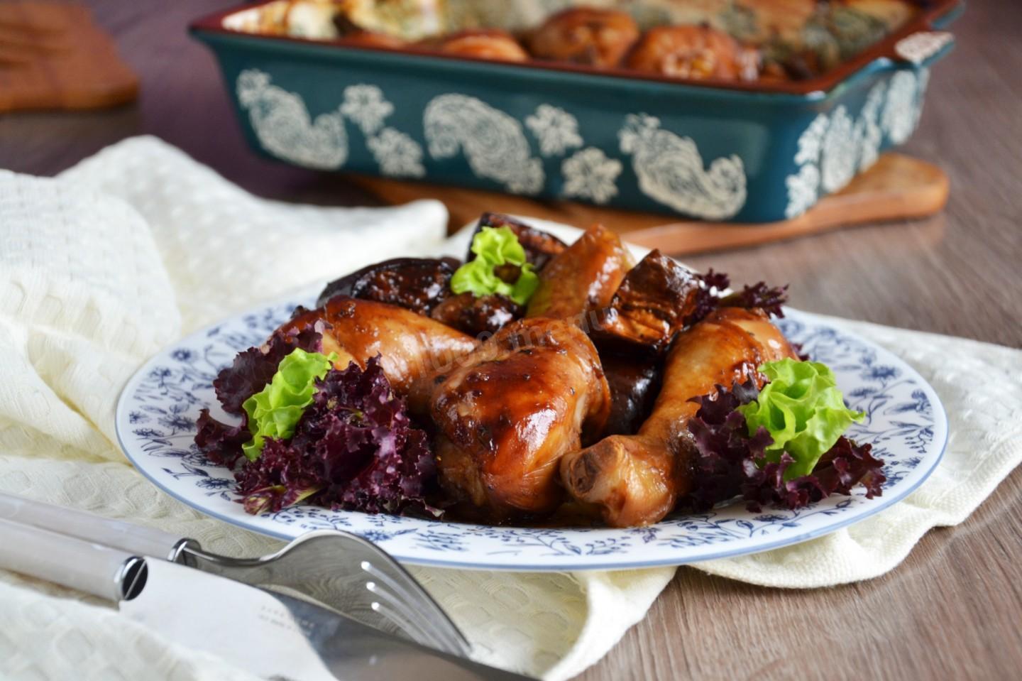 Переложить курицу с баклажанами в форму для запекания и поставить в разогретую до 200°C духовку на 45-50 минут. В процессе запекания несколько раз поливать курицу соусом со дна формы.