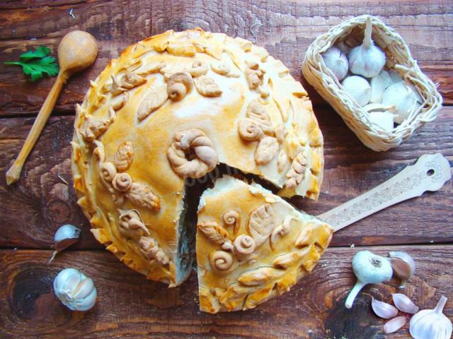 Раскатываем вторую часть теста и прикрываем все слои начинки. Бортик красиво сворачиваем. В центре формируем дырочку для выхода пара. Из оставшегося теста вырезаем различные украшения по вкусу: листочки, цветочки, птичек и т. д. Украшаем пирог.