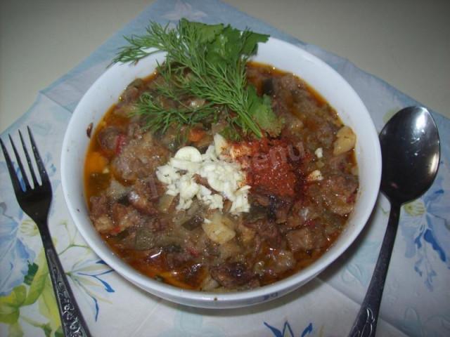 Вместе смешать картофель, редьку и морковь, все нарезанное кубиками. Добавить капусту нашинкованную и нарезанный сладкий перец. Сложить все это в казан и жарить до полуготовности. Посолить, поперчить, положить лаврушку и долить воду. Чтобы вся масса получила консистенцию густого супа. Варить минут 15.