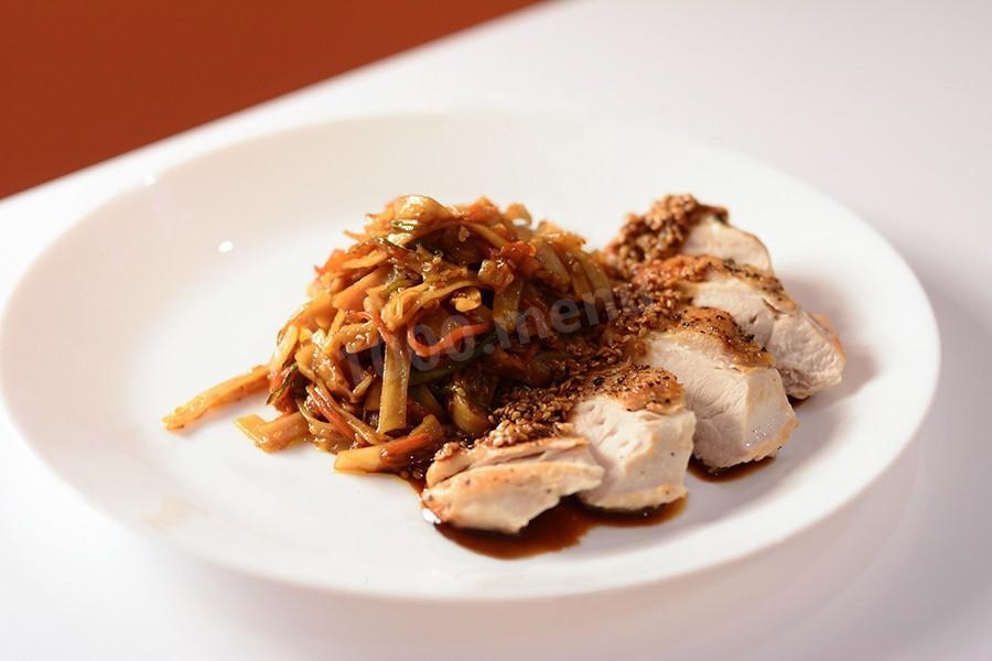 Лапша удон с овощами под кунжутным соусом с куриной грудкой
