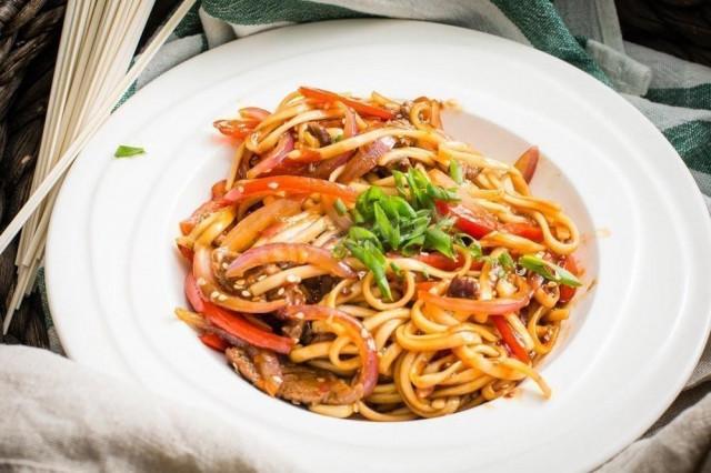 Также полосками нарезаем перец. Добавляем овощи в сковороду, обжариваем буквально минуту, добавляем отварную лапшу к мясу и овощам,перемешиваем, обжариваем минуту, а то и меньше, выключаем огонь,накрываем крышкой. Самое главное не пережарить овощи, они не должны быть мягкими, они должны быть состояния "аль-денте". При подаче готовое блюдо можно украсить кунжутом или веточкой зелени.