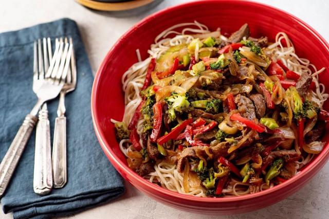 Лапшу удон (можно заменить другим видом лапши), отвариваем в кипящей воде до готовности, отбрасываем на дуршлаг и промываем. Раскладываем лапшу по тарелкам, сверху добавляем мясо с овощами и подаем к столу.